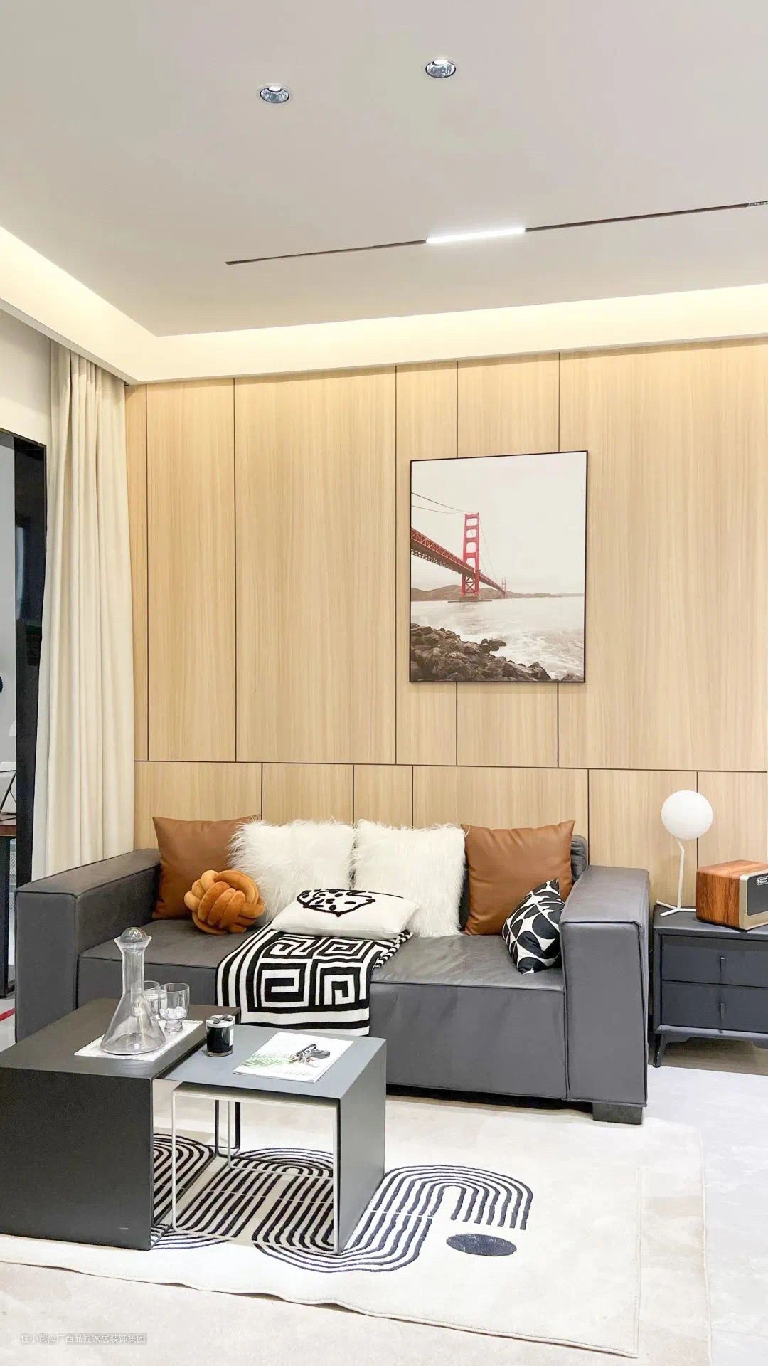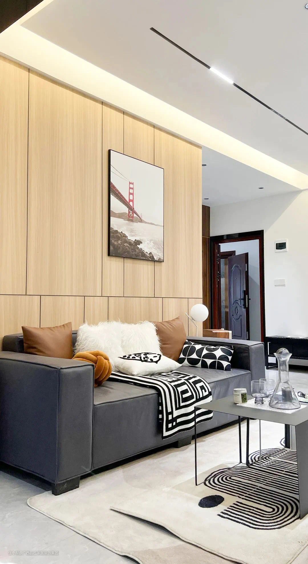 沙发背景墙用深棕色实木材质的收纳柜代替,视觉上看自然沉稳,复古大气,不同于普通白灰色收纳柜,让人有眼前一亮的感觉,同时因为是一门到顶,高大壮观有特点,颜值性能双双拥有。