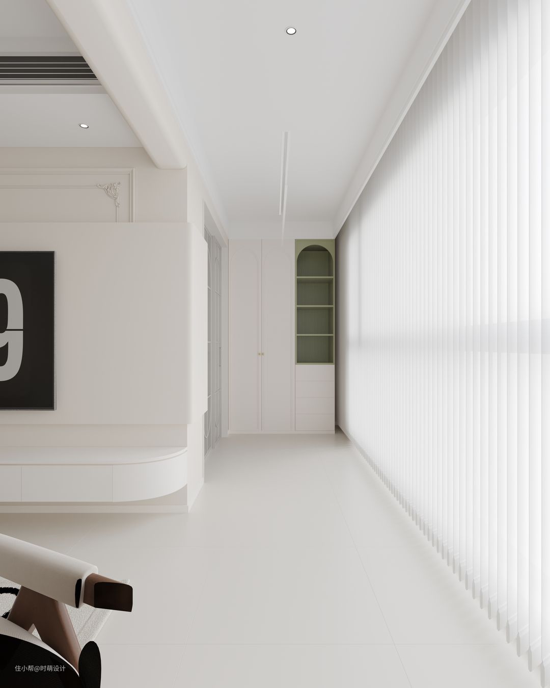 主卧室通过巧妙地调整门的位置,为床尾布置一整排衣柜创造了良好的条件。这 5 米长的衣柜不仅拥有强大的收纳能力,还为主人提供了更多的储物空间。考虑到屋主在主卧休息的时间较长,为了提升居住的舒适度,我们在主卧也保留了一个美的设计家Ⅱ除醛中央空调出风口。这样的设计为主人打造了更优质的睡眠环境,让每一个美好的梦境都能沉浸在舒适的温度中。尤其是在入睡前,屋主可以通过美的美居app 轻松控制温度、新风换气等多个系统,无需为了控制中央空调而起身。这种贴心的设计,无疑为屋主的生活带来了极大的便利。