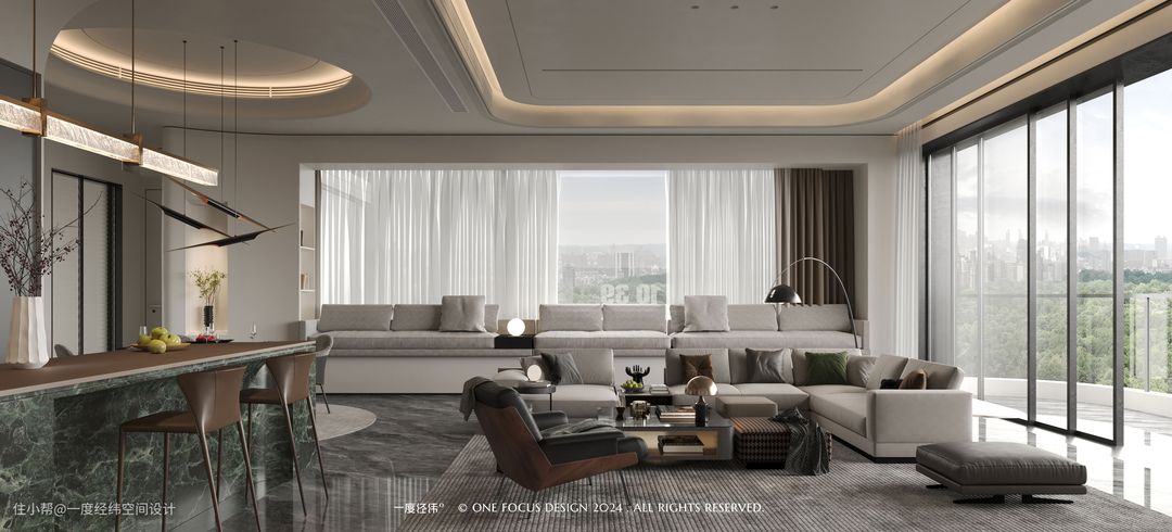 我们选用现代轻奢风格中的意式风格打造,无论是空间布局还是软装搭配,崇尚内敛含蓄的设计,艺术感受与实用功能兼具,绿色石材与意式轻奢主义相互融合,以高品质、经典、时尚演绎现代美学,营造出现代而高级的氛围。这里巧妙地运用圆弧和曲线元素,为空间增添了一丝柔和与优雅。柔软的沙发和抱枕为家人提供了一个舒适的休息场所,而落地窗则引入了大量的自然光线,使得整个空间更加明亮通透。客厅的装饰也体现了现代简约的风格,没有过多的繁琐装饰,却又不失品味。壁炉的存在更是为这个空间增添了一丝暖意和亲密感,让人在这个空间中感受到温暖与舒适。整个设计既具有现代感,又不失经典韵味。