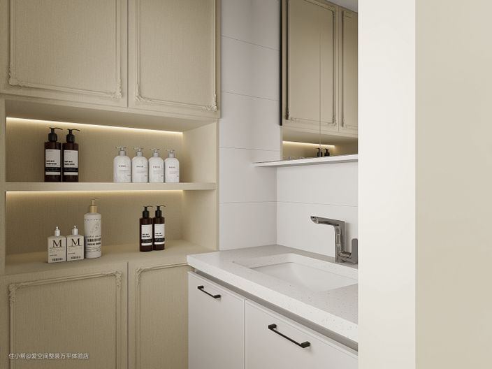 3、卫生间收纳要注意防霉防潮,使用的收纳器皿要看材质,镜柜和浴室柜的边缘尽量包边,做防水处理。