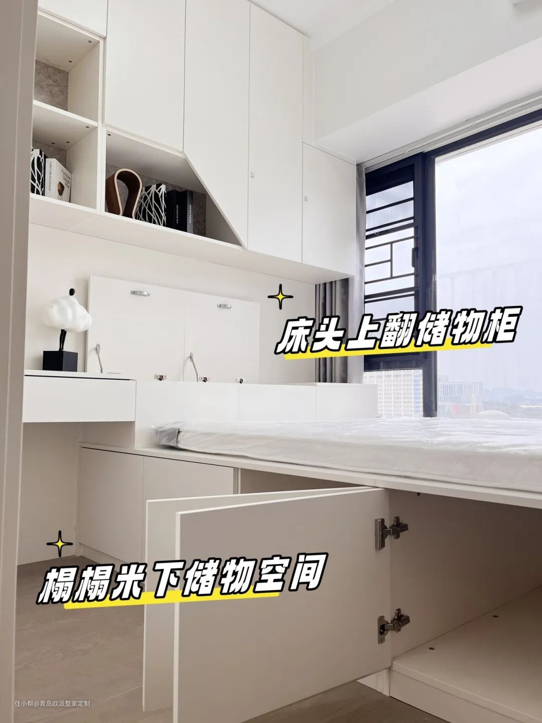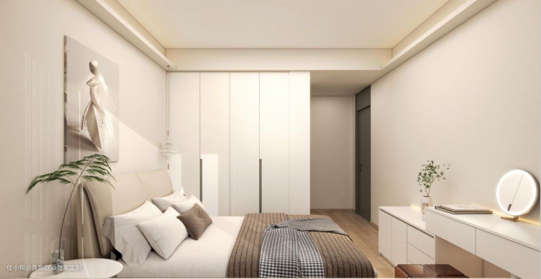 主卧兼顾颜值和功能,主要做了衣柜、飘窗柜、床位梳妆柜三处设计。