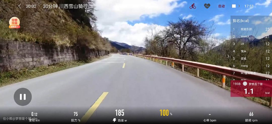 不管是收费课程还是限免内容,将野小兽V5连入到APP后,都可以在手机或者平板电脑的屏幕上查看到当前的运动里程、阻力值、功率、踏频和卡路里的消耗情况,并且还能实时显示自己的排名,这套跟练系统做得相当不错。