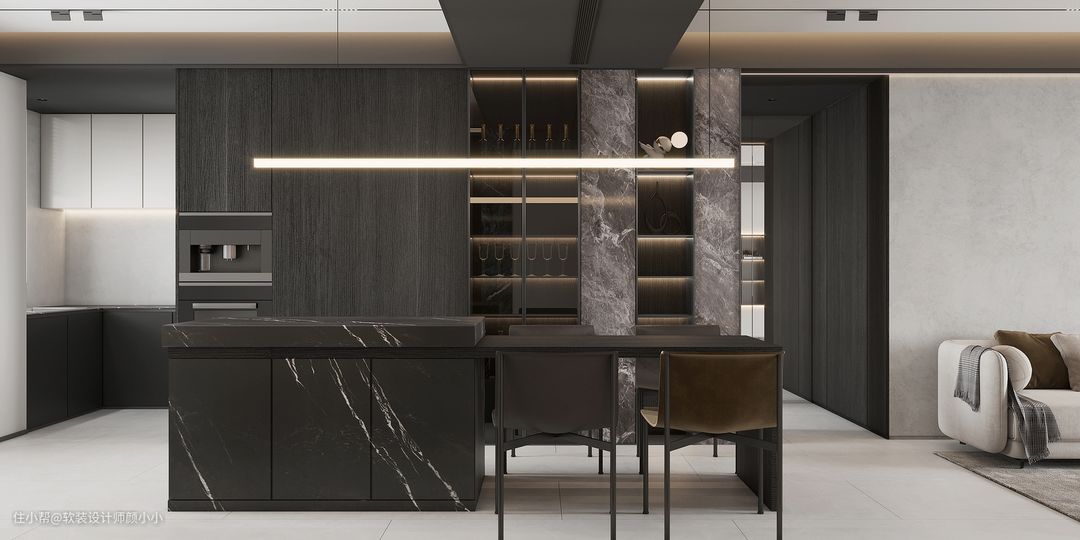餐厨空间沿用灰色为主色调基底,搭配黑色大理石岛台与浅色地板,营造强烈的视觉差。另一侧的壁柜提供了存储空间,既有实用价值的同时也保证了美观。定制餐边柜连通岛台,分担厨房的储物压力,突显餐厨一体性,再利用黑白灰的设计手法实现餐厅与客厅的完美过渡。