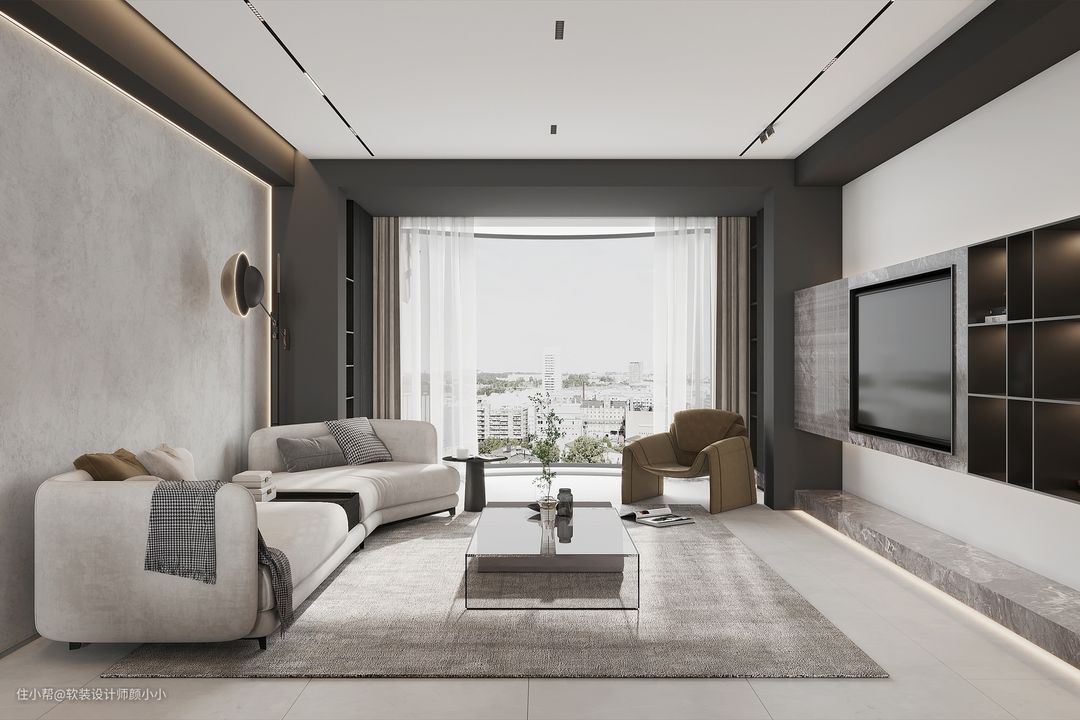 为了营造空间的简约质感,整体采用了白色、灰色为主色调,利用无主灯和悬浮电视墙让视觉更具延展性。增加视觉冲击的同时也兼具了储物功能,可以让业主根据自己的喜好摆放一些艺术手办,空间氛围感再上一个level。