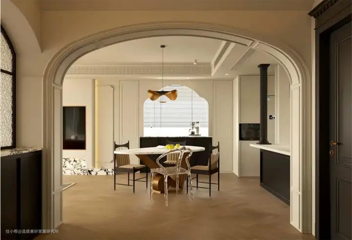 尤其在空间的打造上,除了利用光影增强空间感和立体感以外,还善于用弧形等流动的线条修饰窗体、门框、墙体,让空间以柔和、流动的方式进行联系。