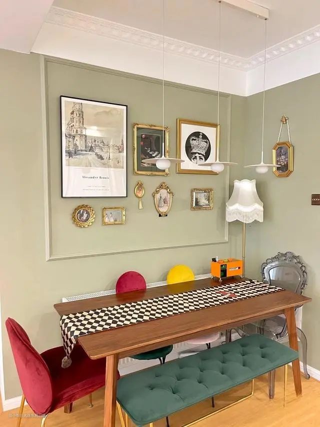 背景墙刷上了复古绿乳胶漆,并简单地加上了石膏线,挂上了几幅油画。这一设计为餐厅增添了法式复古的味道,使整个空间充满了艺术气息,这种绿色背景与油画的搭配,营造了一种优雅、浪漫的氛围,让用餐时充满了情调与品味。