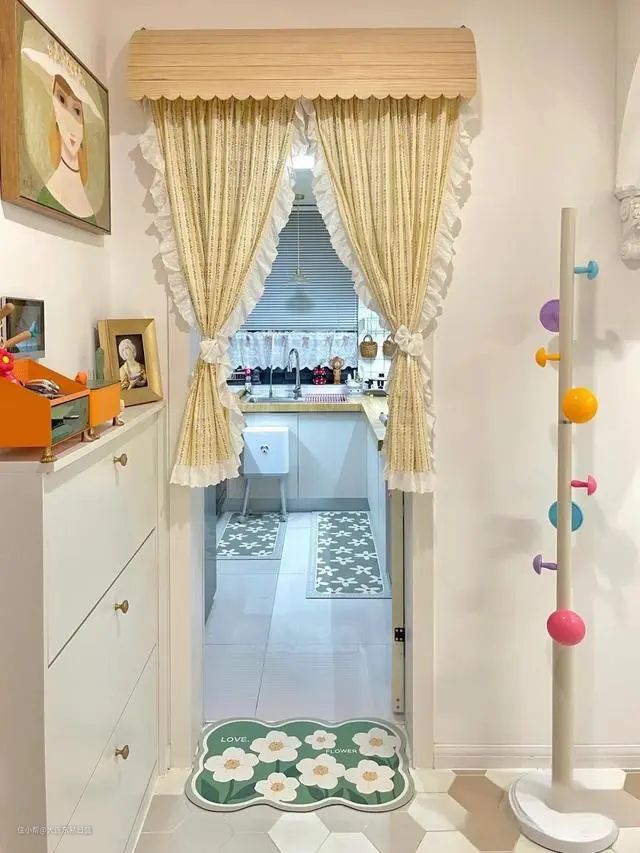 厨房的装饰和布局着实打造了一种温馨的日式风格,厨房门口悬挂着黄色的荷叶边门帘,这一装饰元素为整个厨房带来了浓郁的日式风情,营造出小清新和温暖的氛围。