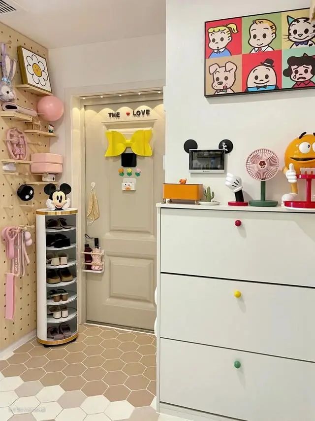 墙上挂着卡通人物和动物装饰画,以及贴纸装饰,为玄关增添了趣味和活泼感,使整个空间更加生动有趣。