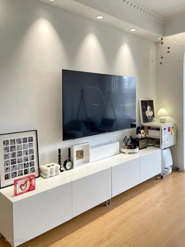 白色细腿矮脚电视柜轻盈整洁,上面摆放着装饰画和摆件,不仅具备了实用功能,还起到了装饰效果,为家居增添了生活气息。