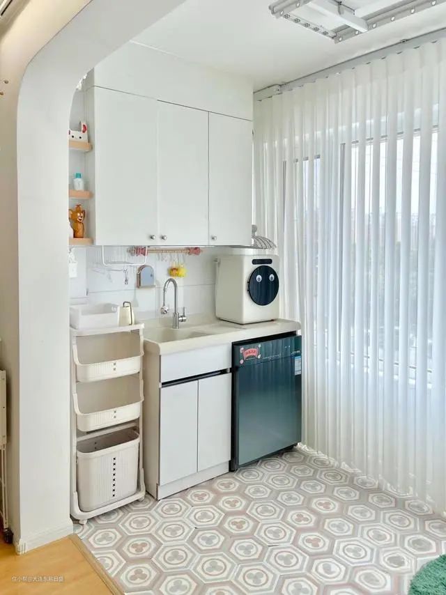 阳台的合理设计确实为家居增色不少,利用阳台空间设计了洗衣柜,巧妙地嵌入了洗衣机,既增加了收纳功能,又有效地节省了空间,现在可以同时手洗和机洗衣物,提高了生活效率。