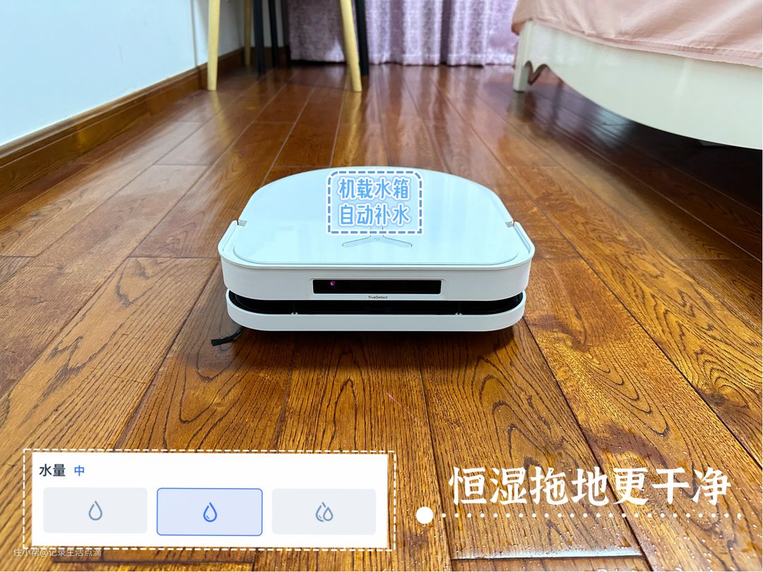 科沃斯X5 PRO自带电控水箱,基站会自动往机身小水箱里加入70℃热水,在拖地时可实时补水,恒湿拖地清洁效果更出色。另外,拖地水量有三档可调,可以根据地面材质来选择合适的水量。