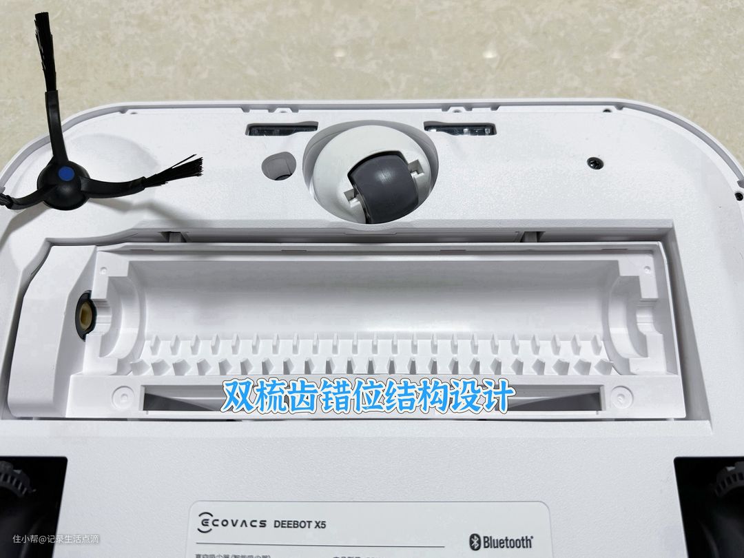 科沃斯X5 PRO在滚刷设计上进行了三大革新,21°V型刷毛设计可以把毛发顺到中间,避免卡在滚刷两端;在滚刷的刷毛中还加入了柔性导电丝,可以消除头发上所带的静电,避免静电吸附。