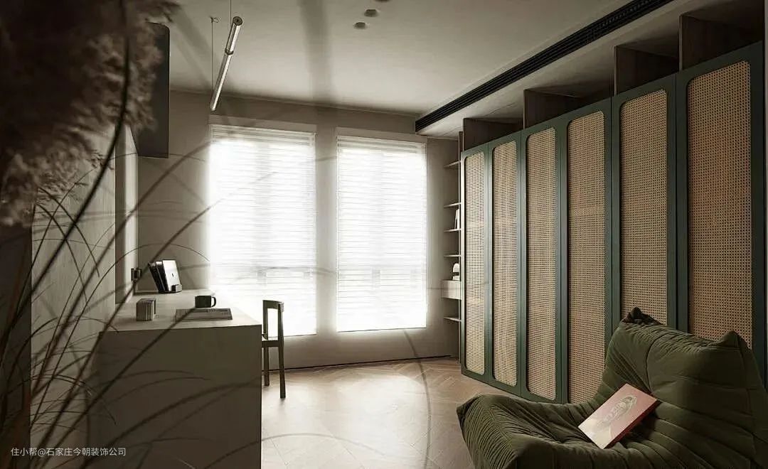 书桌对面打造整排收纳柜,藤编柜门与客厅电视柜、芦苇相呼应,产生强烈的视觉统一感。