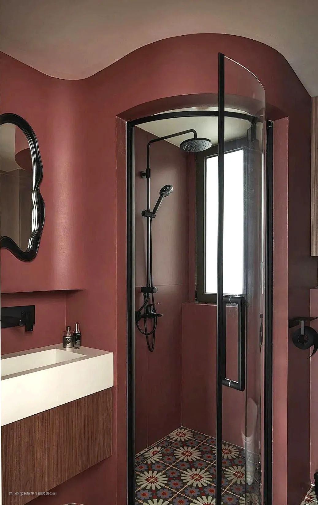 卫生间仅约6㎡,但麻雀虽小五脏俱全,定制40cm深度的岩板一体盆,搭配微水泥红墙和异形镜,极具设计美感。