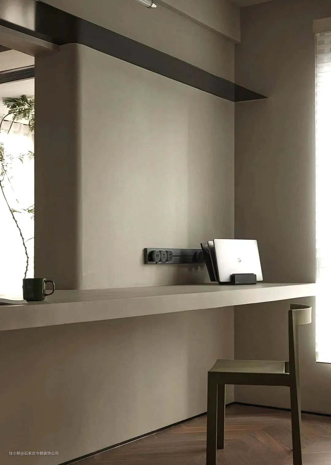 开放式书房现场定制3米长的书桌,满足屋主日常办公需求,立面设计嵌入式钢板,可作为书架或展示架使用。