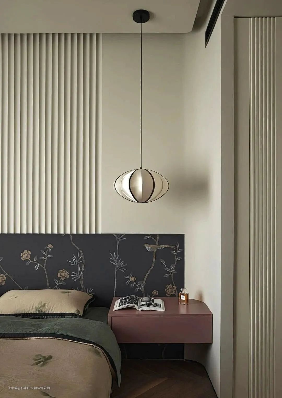主卧延续整屋调性,淡色调乳胶漆作为底色,搭配几何线条、花鸟壁纸和中古吊灯,元素丰富,却不显得繁琐,瑰丽感满分。