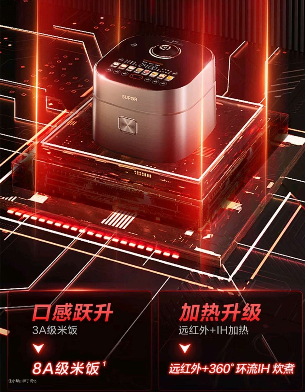 而360IH加热技术则是一种全方位的加热方式。不知道大家还知道柴火灶是怎么做饭的吗?柴火灶之所以好吃,就是因为上中下全方位沸腾。所以苏泊尔远红外电饭煲也是号称“柴火灶”的呢。