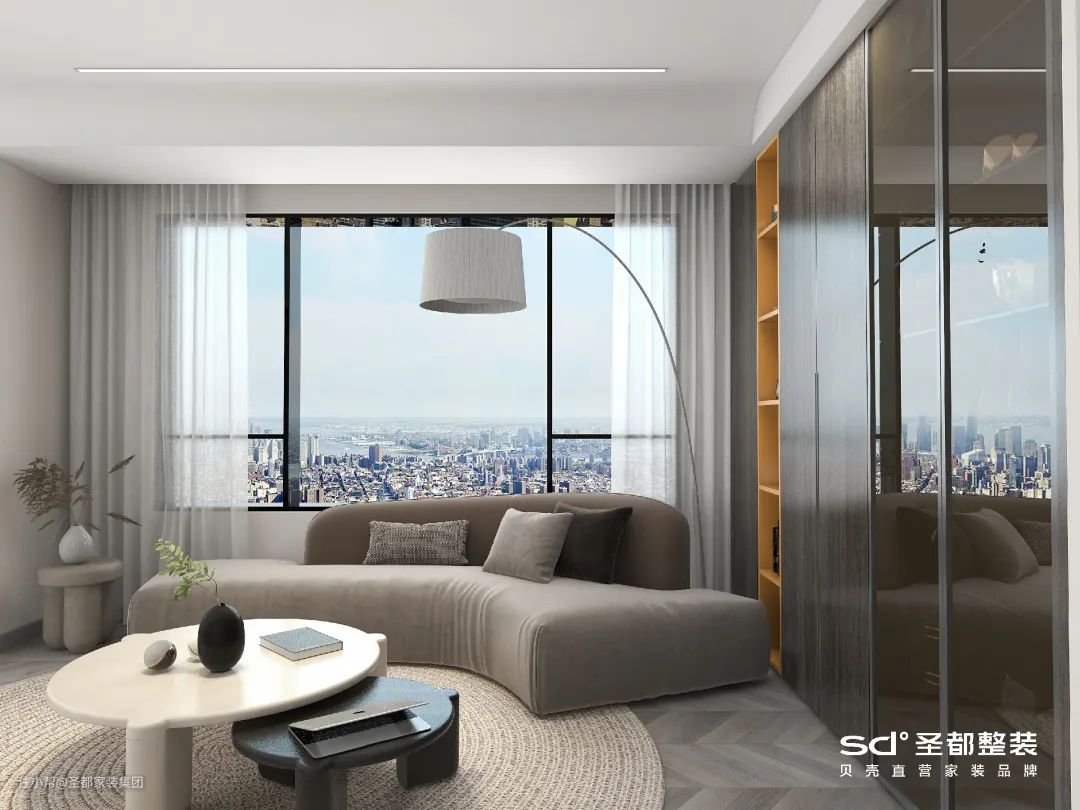 客厅与阳台相连通,再配上大大的落地窗,能360°引光入室,全天都能沐浴在温暖日光和温柔月光下,给日常生活增添了许多诗意。