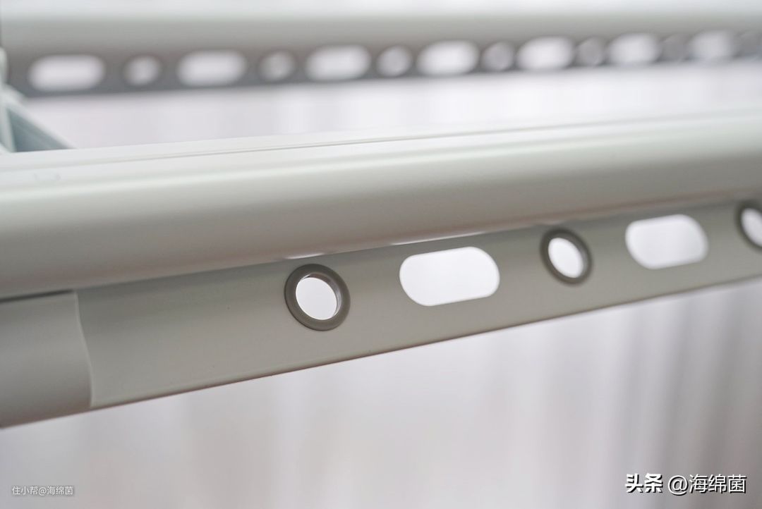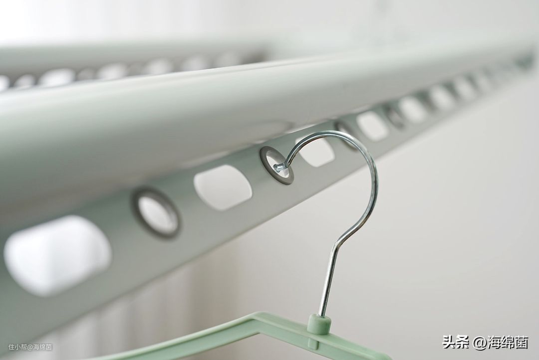 同时晾孔人性化的采用了外翻45°的设计,实测在挂取衣架的时候就会非常顺手,相比垂直的晾孔来说,挂衣服的时候判断会更准,基本不会失误,可以说是一挂一个准。