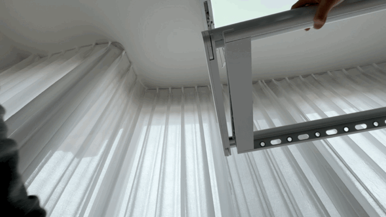 晾衣机不使用的时候就是一台吸顶灯,同时我们可以看到LED灯板采用了曲面设计,灯板的两侧是曲面且上翘的,这样照明时就能提供更宽广的出光范围。