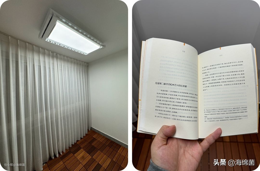 不开灯的时候换个角度看一下,曲面设计流畅美观,下面即便挂满了衣物,整个阳台依旧能保持不错的亮度。