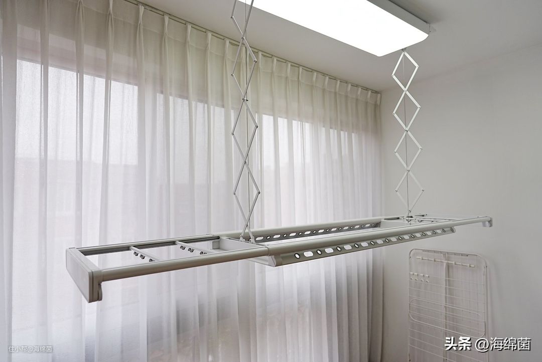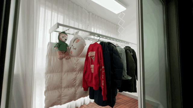 同时也有些大件的纺织品,比如厚实的四件套,用烘干机效果有时并不理想,烘了几个小时以后依旧会有些潮潮的,要么继续再烘,要么就选择再次晾晒。我家在装修时就有点高估了烘干机的实力,所以完全没有安排晾衣杆或者晾衣架,后来只能入手了一个落地可折叠晾衣架。不过缺点也是比较明显的,只能晾晒少量的衣物,同时遇到被套床单这种,因为高度不太够,还会拖到地面上。当然还有占地的问题,一旦展开晾上衣服,阳台空间基本就被完全占据了,用完还要收起来,属实是有点麻烦。