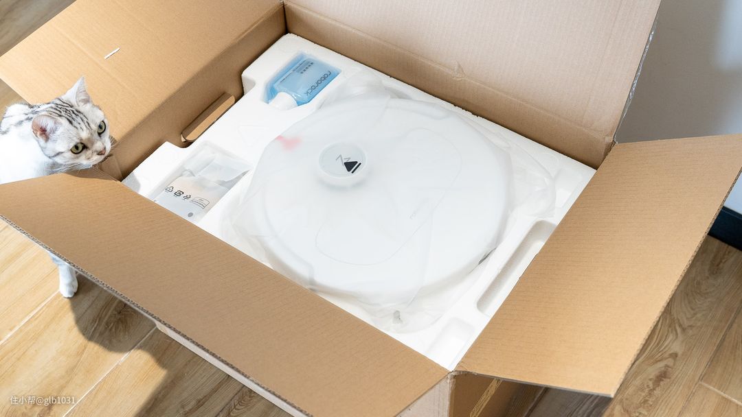 打开包装就是分层设计,第一层就可以看到产品本体、清洁液以及尘包。开箱过程中就被家里的猫主子围观。