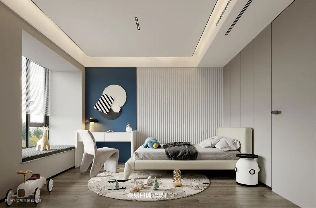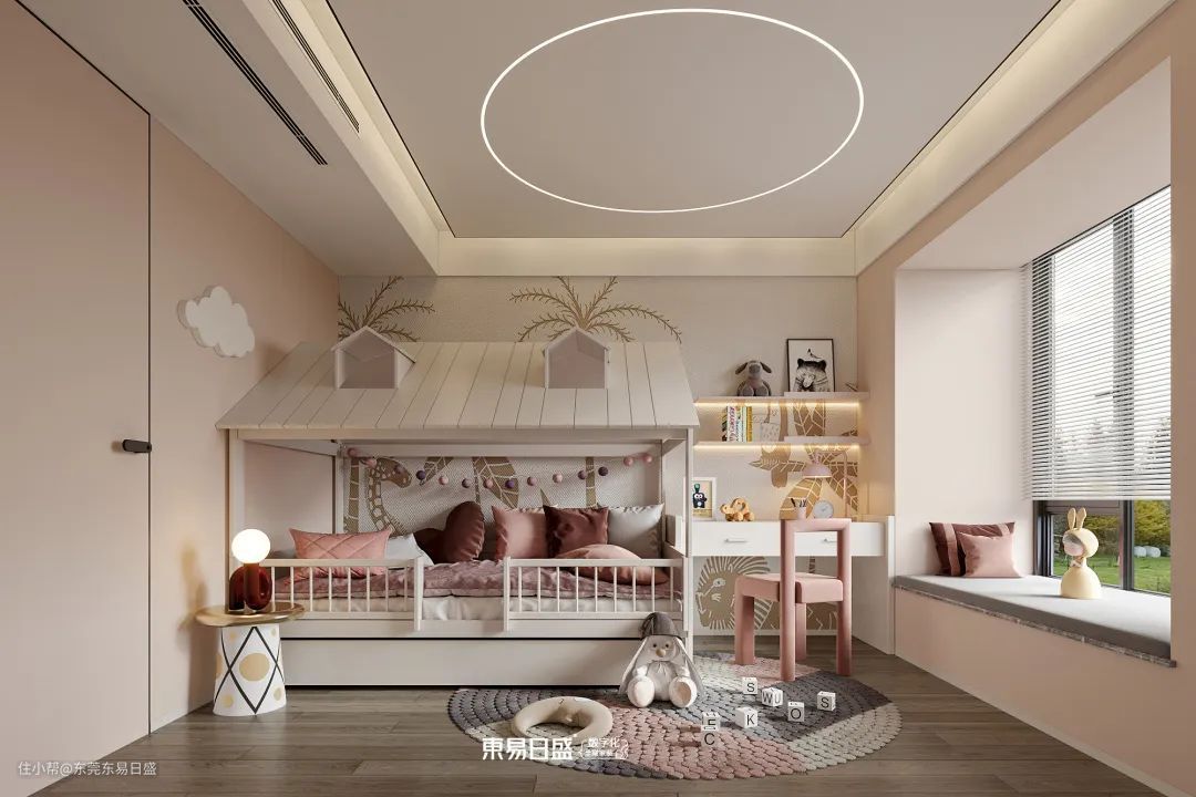 在儿女的独立卧室设计中,设计师同样注重实用性与艺术性的结合。通过蓝粉配色来区分性别差异,培养孩子的性别认知。在空间软装上,选择符合孩子年龄阶段的童话元素,如可爱的小汽车和自带小屋设计的儿童床,同时还保留了孩子的玩乐区域,让整个空间充满了童趣。