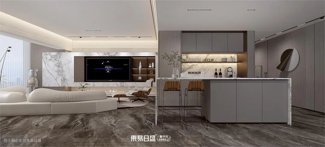 紧邻沙发的是开放式酒柜吧台,这里被定位为西厨区域。这样的设计不仅增加了空间的交互感,也丰富了娱乐空间的多样性。