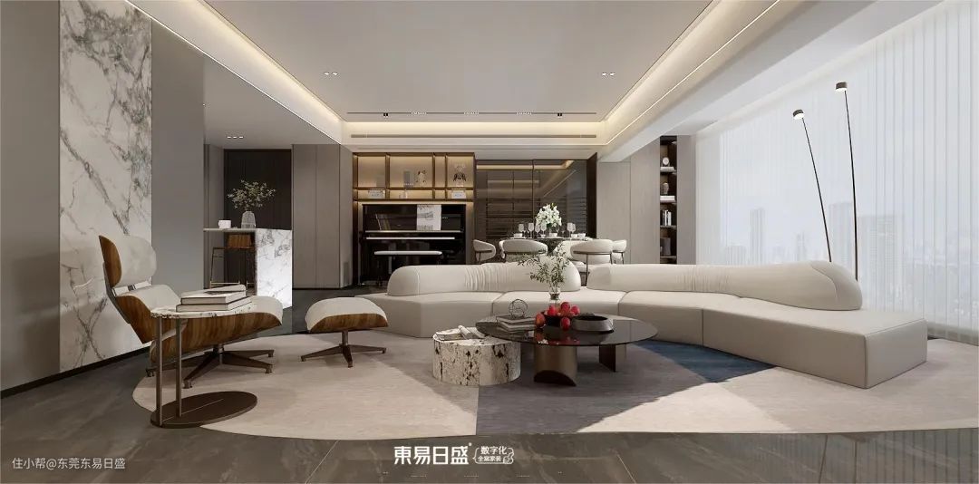 大平层的优势在于家具选择上的灵活多变。设计师特意挑选了一款C字型的流线型沙发,其流畅的线条和弧度的靠背,使得整个空间更加舒适和高级。同时,搭配梦幻帘的设计,为公共空间增添了一份朦胧的美感。
