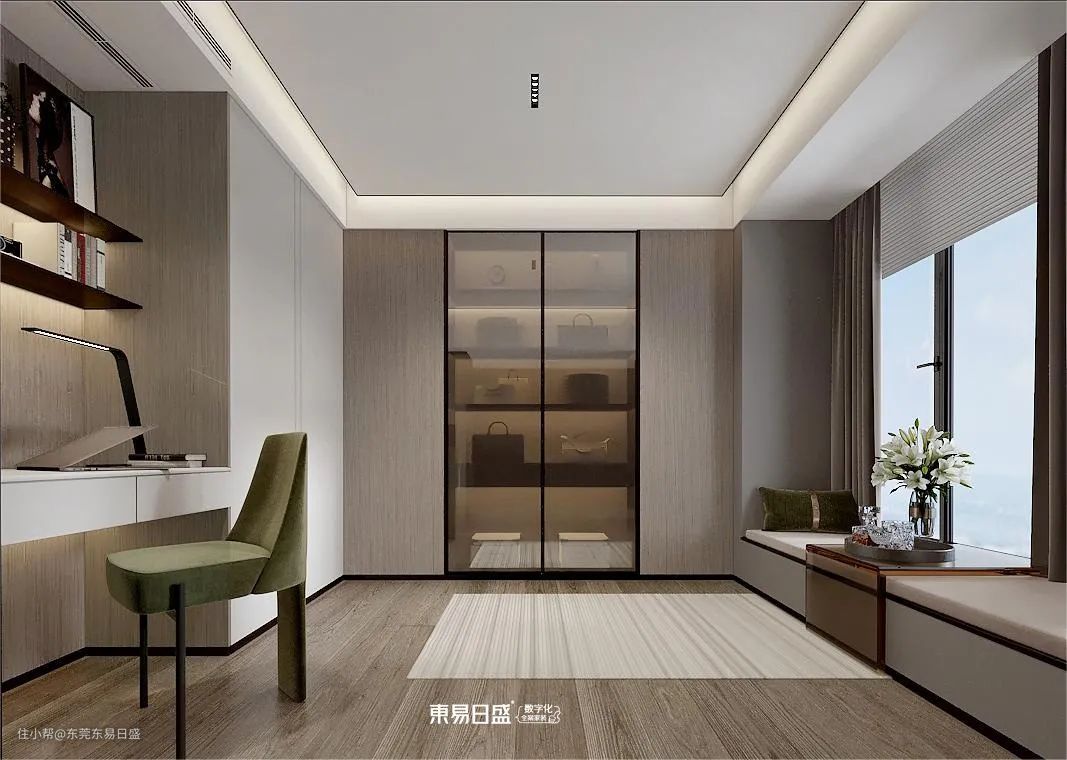 多功能房则毗邻餐厅区域,既可作为收纳奢侈箱包的展示区,也可作为书房办公区域,满足了业主的多种需求。