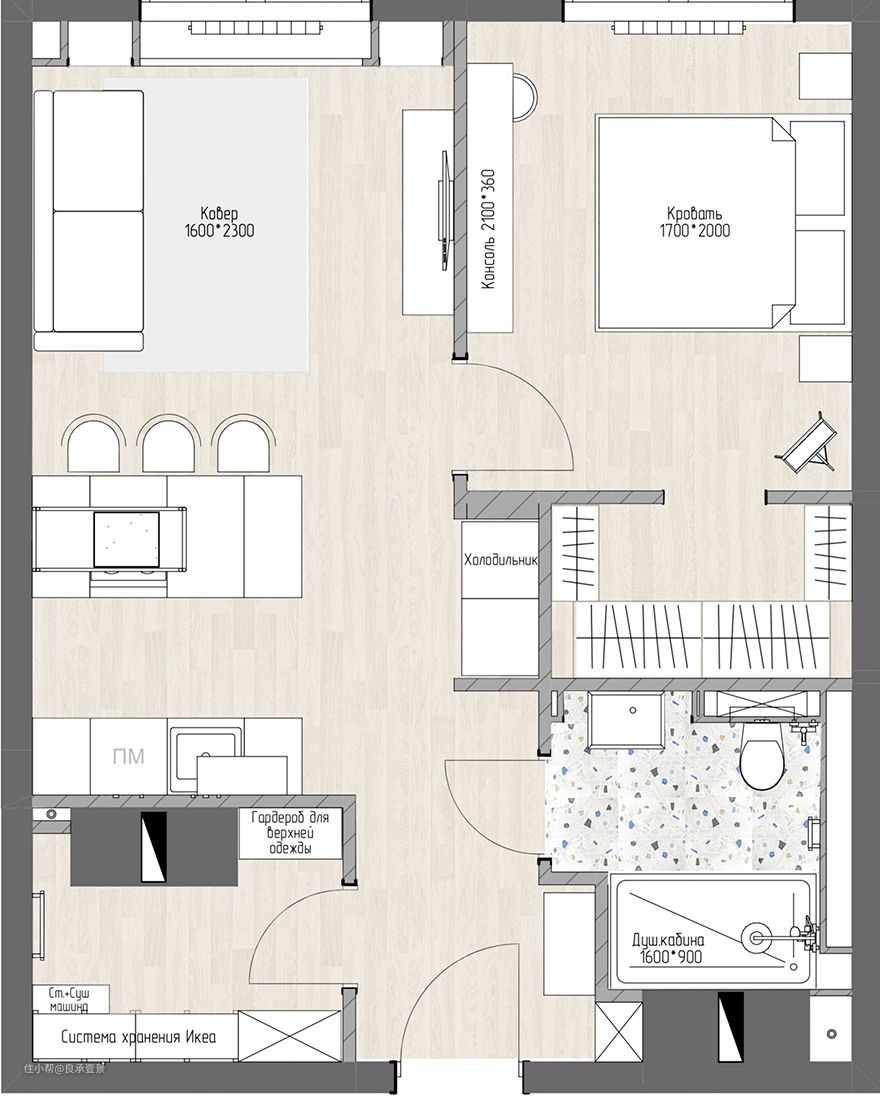 公寓面积45平方米,优点:形状正确,两扇大窗户,城市全景,位置优越。最初,公寓有一间浴室、一间储藏室、一个小大厅和两个独立的房间——一间卧室和一间厨房客厅。在重建过程中,我们能够分配另一个更衣室,使后勤更加方便,在小面积内设计出符合人体工学的空间。