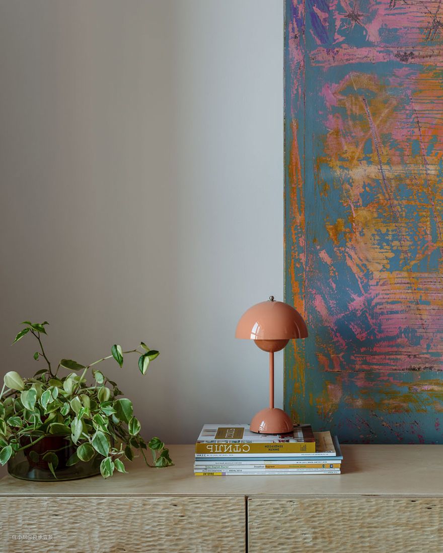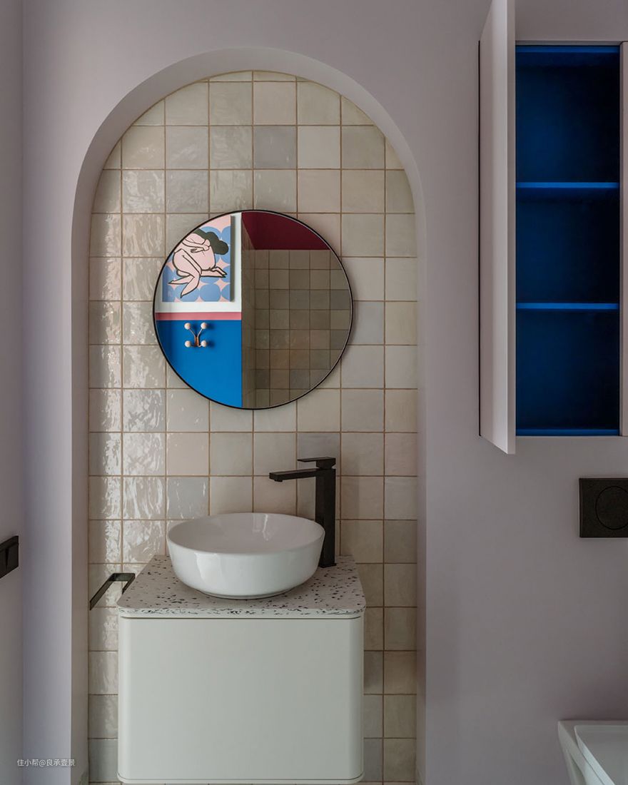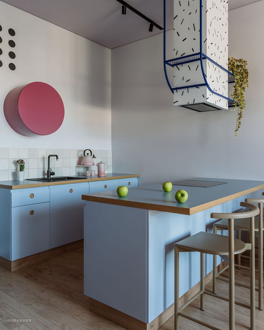 业主希望将室内装饰表现得俏皮、简洁。厨房是包括一个圆形橱柜、一个抽油烟机盒子和一个框架金属架子,以及墙上的装饰品。”