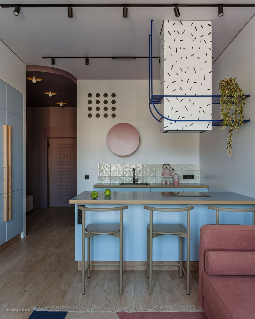 - 装饰风格:俏皮、简洁是主要风格。厨房设计包括圆形橱柜、抽油烟机盒子、框架金属架子和墙上装饰品。