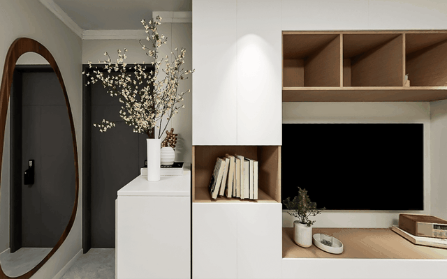 转角又直接与电视背景墙的定制柜成为一体,白色柜体整齐统一,定制柜也做了分区,有开放格口,也有带柜门的设计。