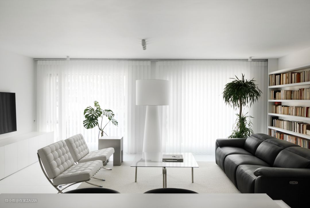 以纯白为主色调的客厅,透过纱帘的光线甚至也被“过滤”成了白色。纯白色的乳胶墙漆、同色的哑光地面、纯白色烤漆的电视柜门、超大的白色落地灯,让整个客厅白得干净又纯粹,这种感觉被延续到全家的每个空间。
