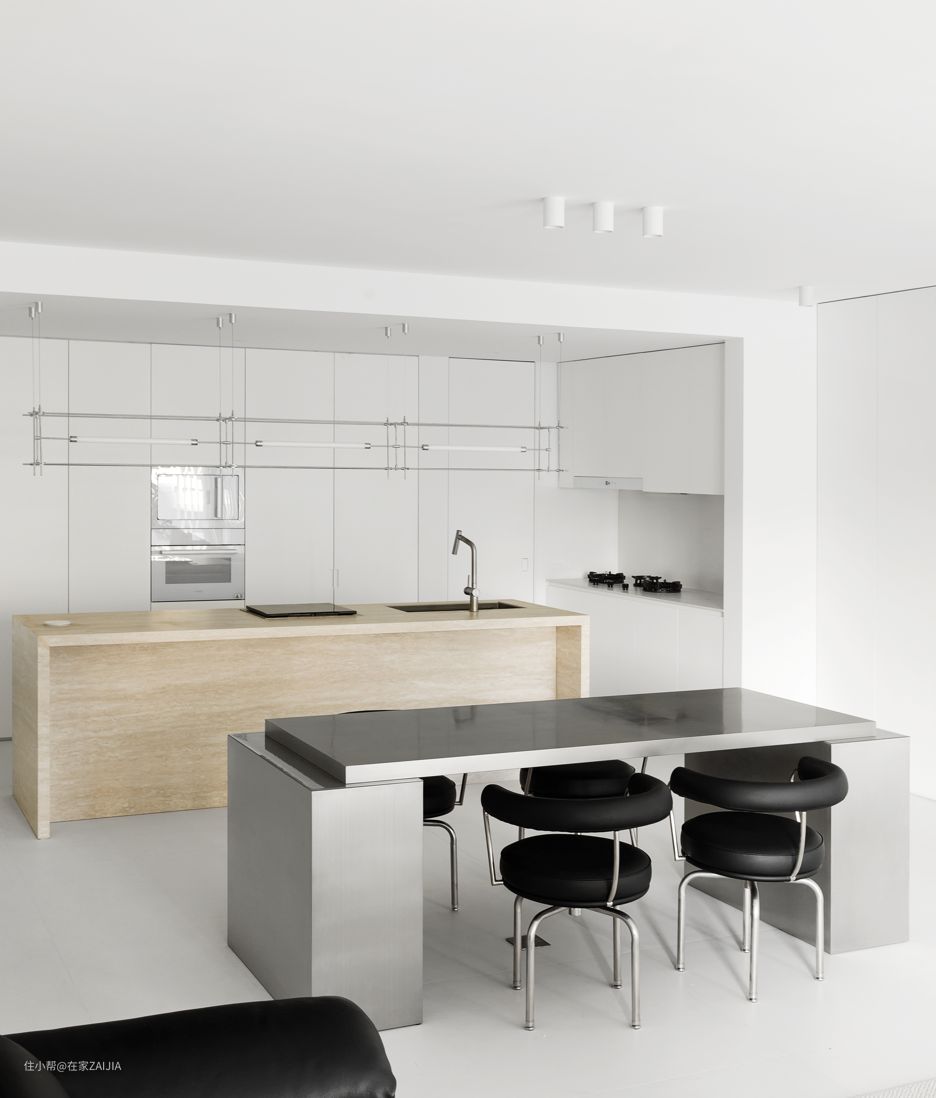 整个餐厨区域,设计师用不锈钢和洞石两种材质的搭配,收获了一种更高级的层次和空间秩序。