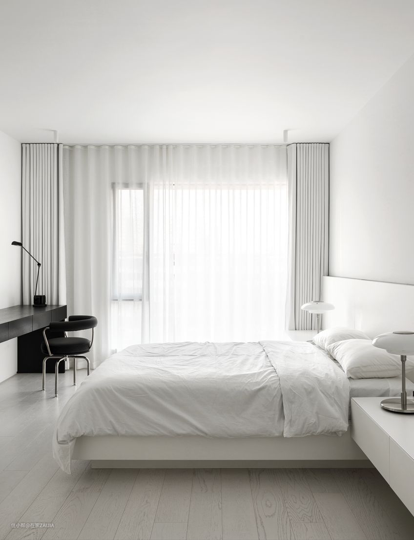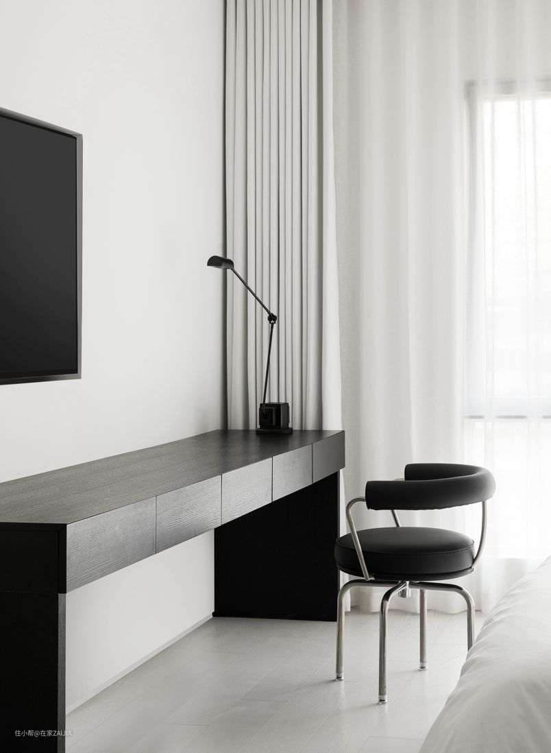 设计师用白色木纹地板,搭配极简的线条和低饱和度的颜色,在与其它空间形成风格上延伸的基础上,把减法做到了极致。