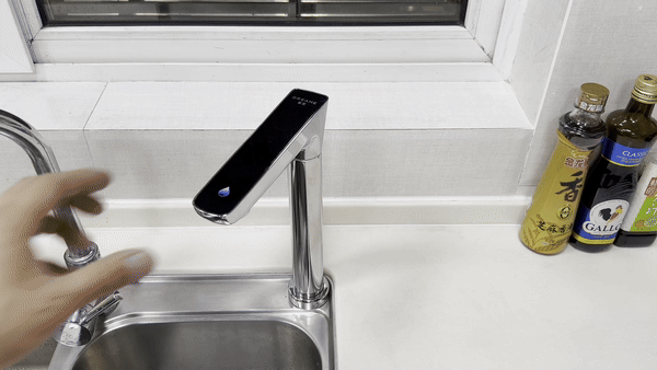 智能龙头的高度足够高,即使旋转到台面上也能用保温杯接水,再也不用为保温杯身过高无法接水而烦恼了。