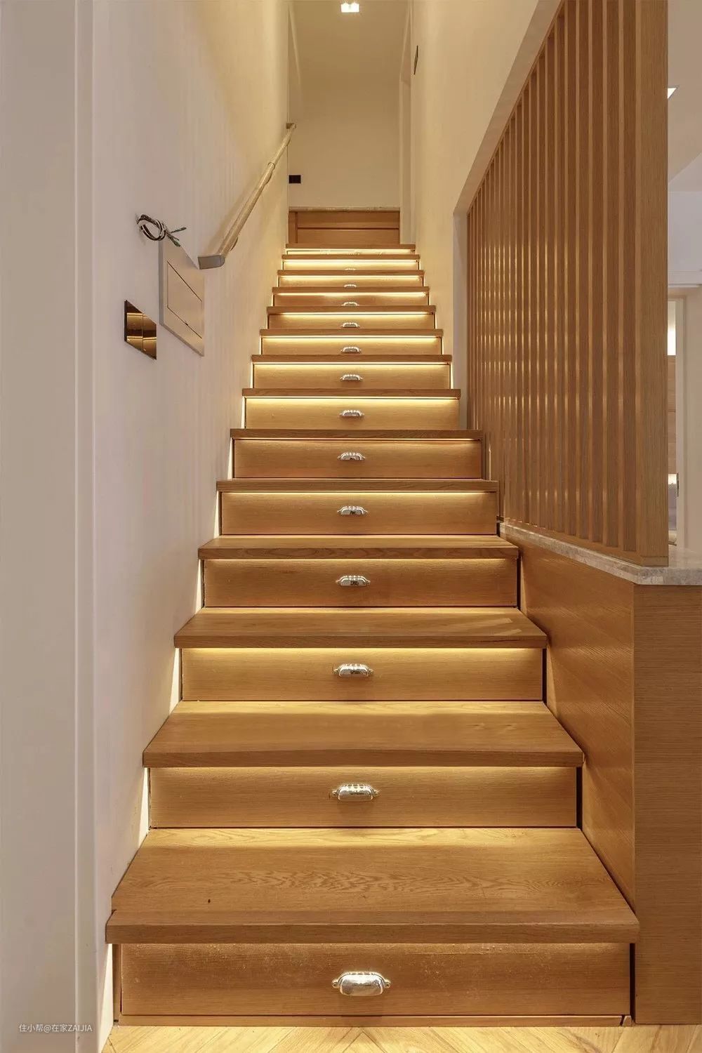 楼梯台阶底下都安装了灯带,可调节亮度,方便拉开抽屉寻找东西,夜晚也可以降低亮度,上下楼很有安全感。