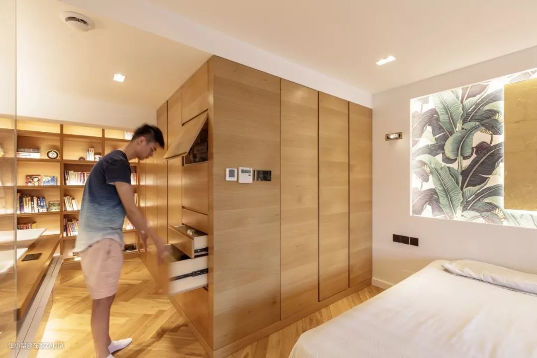 书桌的背后还增加了一面顶天立地的衣柜,冬季衣物、棉被大衣、行李箱,都可以满满当当的收纳在这里。