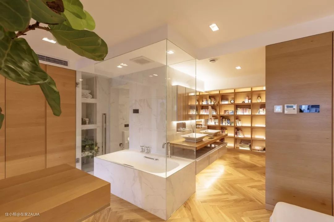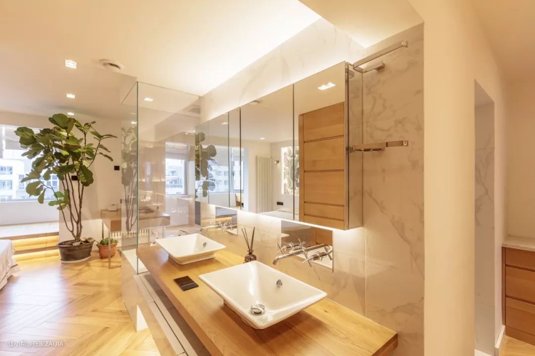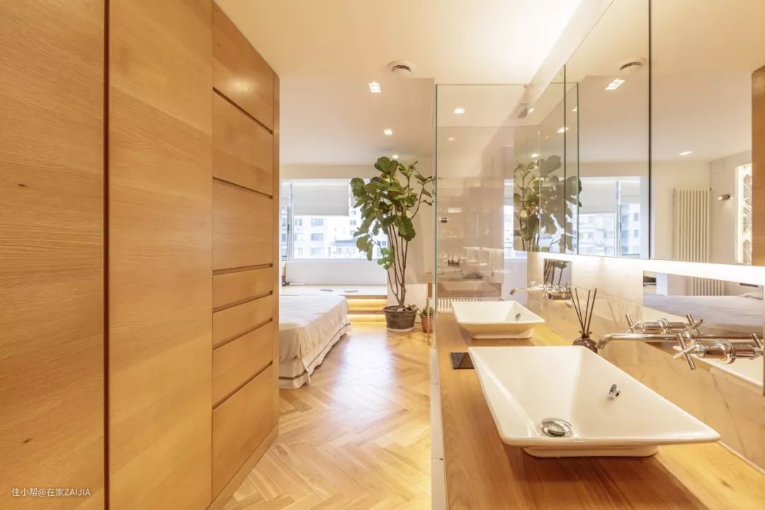 设计师解决办法:主卫的承重墙体不能拆,索性把浴缸和干区包在卫生间外面,浴缸通过玻璃围挡,保证水汽不会向外扩散,外置的干区盥洗台与衣帽柜过道布局在一起,优化动线。