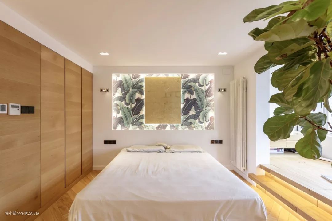 主卧的背景是为了规避不可拆卸的暖气管,所以加了一层墙,利用墙体夹层的厚度包裹管道,同时把嵌入式阅读灯暗埋进去,中间没有管道的部分做了灯槽。