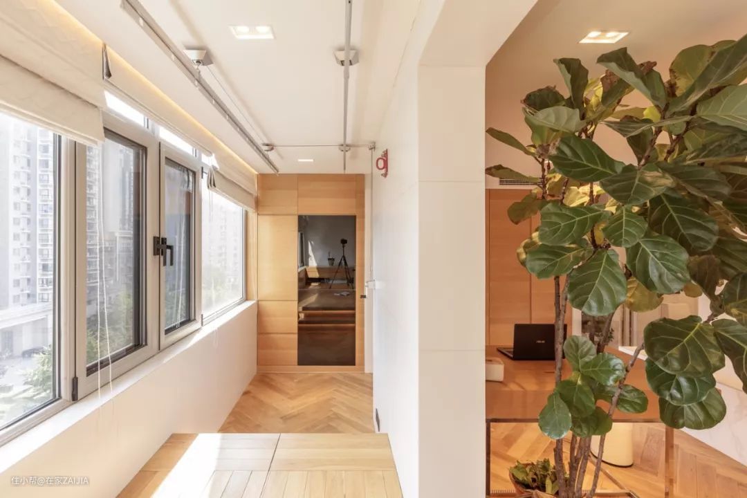 阳台的通道非常长,连接客厅和书房,形成了一个洄游动线。