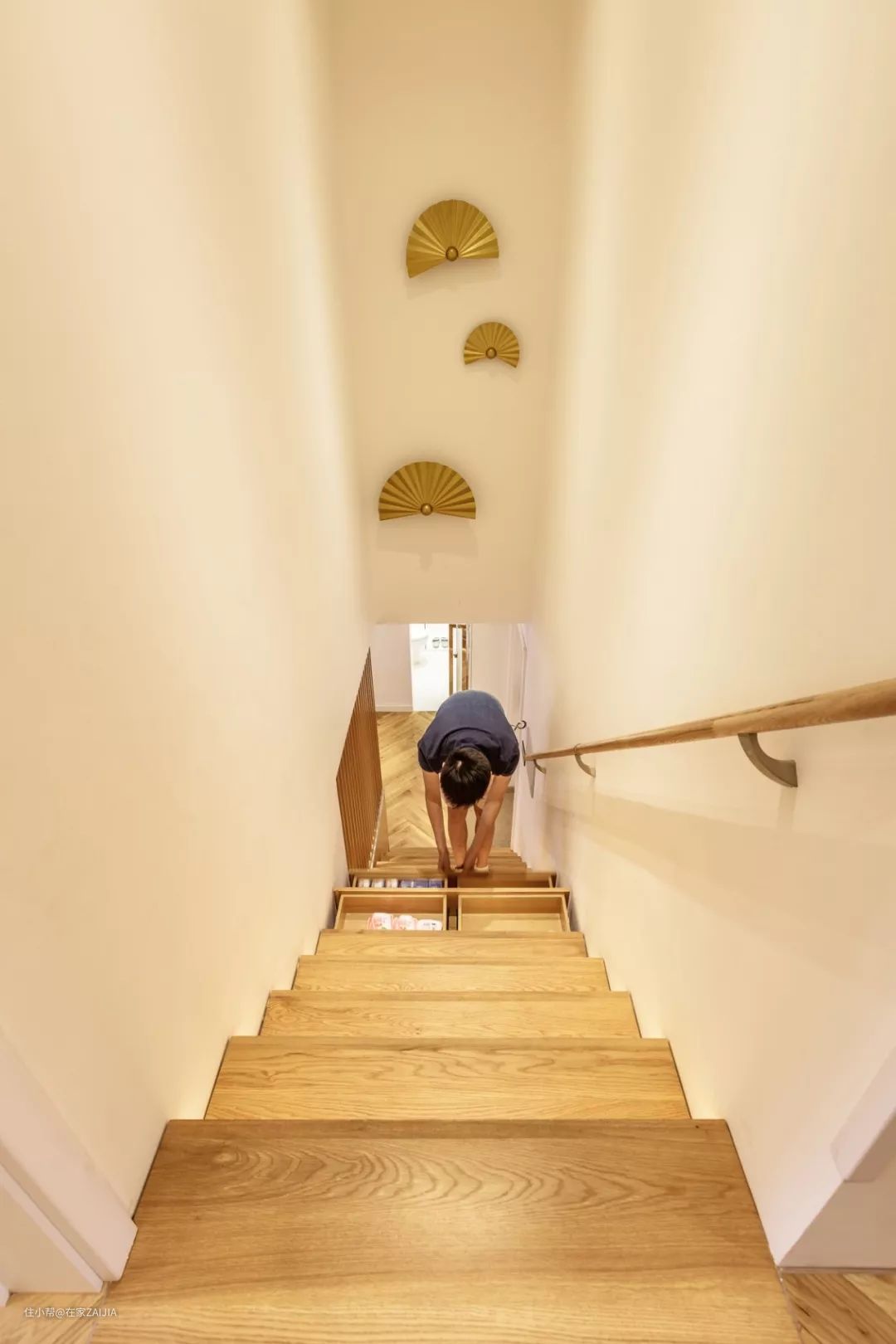 老房的楼梯与建筑一体不可拆除,设计师在原有的楼梯上,每一阶台阶安装了单独的抽屉柜,再加上木质踏板,最底下的几层抽屉放通勤的鞋子,也可以顺势坐在台阶上换鞋。