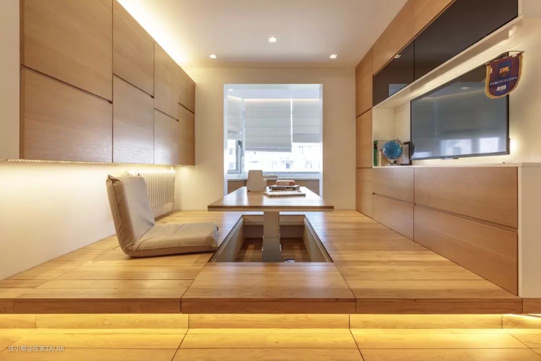 地台中央是电动遥控升降的长桌,四周是上翻门的储物地柜,平时屋主会在这陪孩子学习,偶尔也会当作茶室,把电动桌降下来,还能在地台上打地铺。