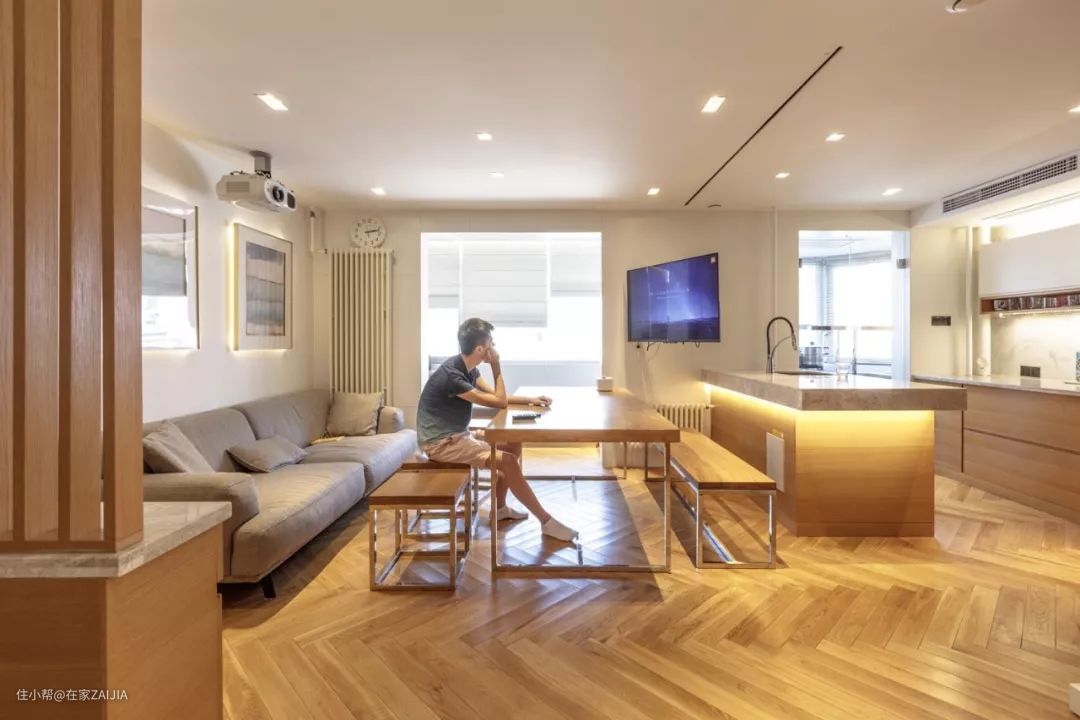 客厅的层高很矮,所以灯采用了无主灯设计,客厅和厨房用了一些嵌入式吊顶射灯为整个空间提供高明度照明。