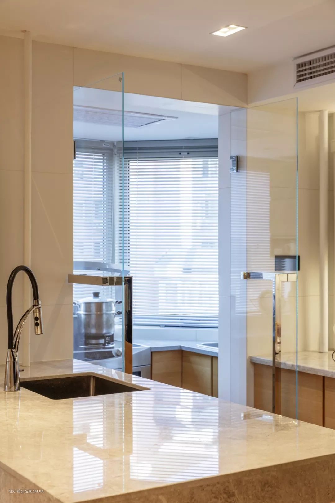 玻璃门外的阳台就是中厨区,为了防止油烟扩散,安装了玻璃对开门,即便双手端着锅也能用手臂或着背把门推开。