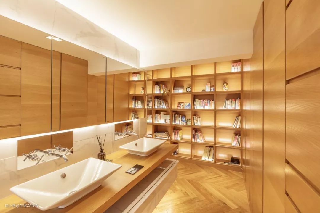 左边的这条过道两边布局着书架、衣柜以及主卫干区;右边的过道两边布局着淋浴区和马桶区。