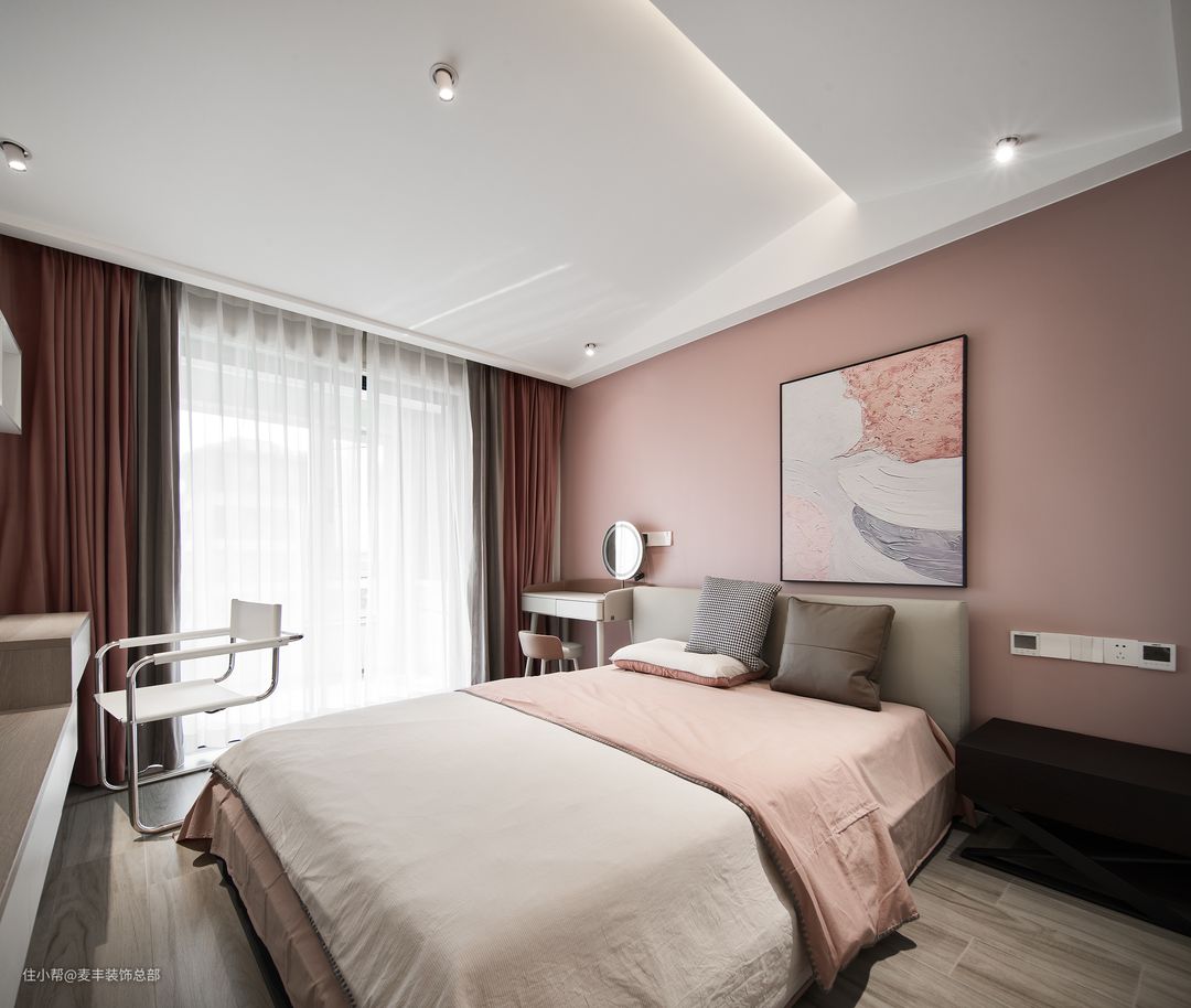 适宜选用采光优良的卧室,给人以美好静谧的感觉,低饱和度看起来更加柔和,其余三面墙壁可考虑采用杏子灰、大白墙、可可蛋奶等色调。